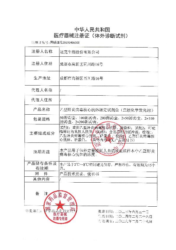 乙型肝炎病毒核心抗体检测试剂盒(化学发光法)