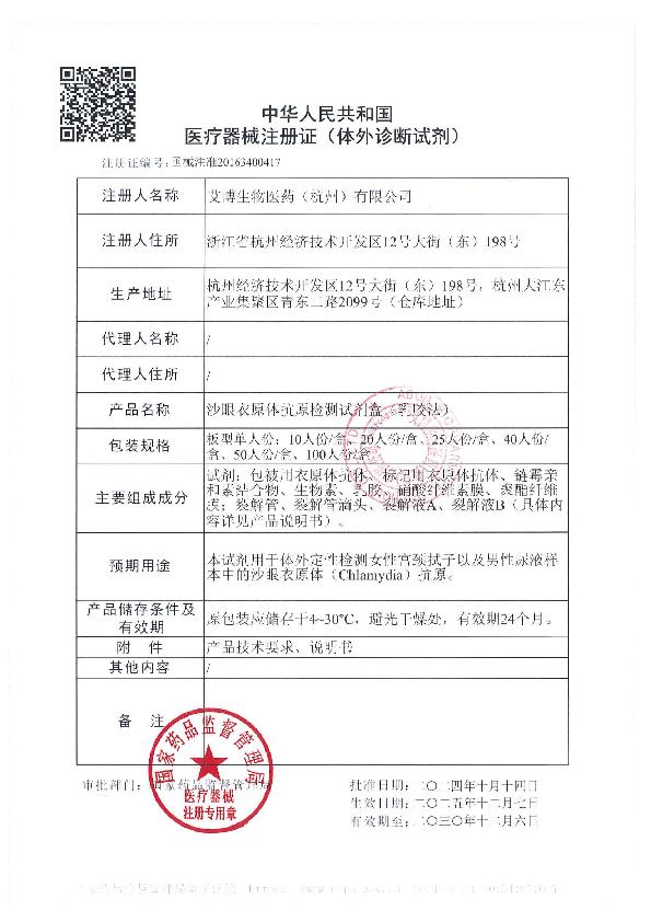 适用范围/预期用途:本试剂用于体外定性检测女性宫颈拭子以及男性尿液样本中的沙眼衣原体(Chlamydia)抗原。