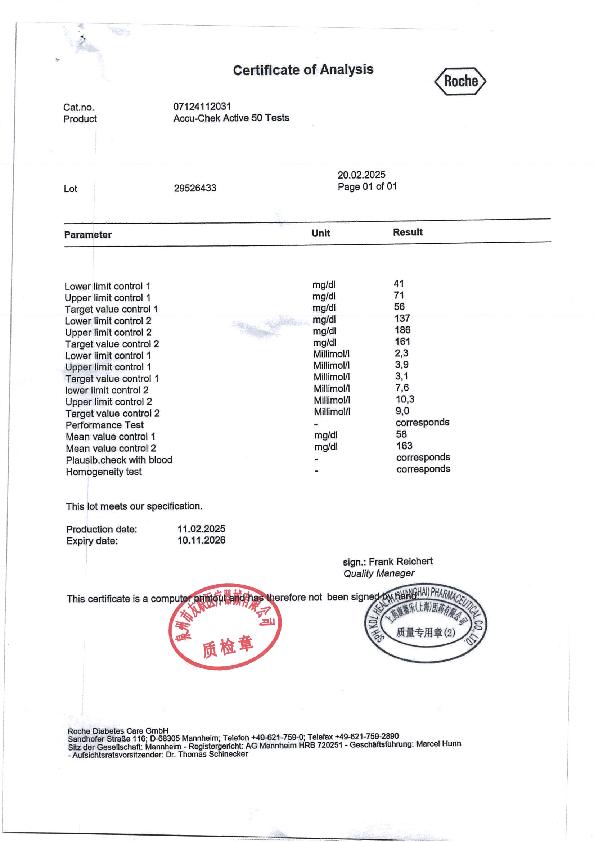 适用范围/预期用途:本产品用于定量检测新鲜毛细血管全血中的葡萄糖浓度。检测部位可以是:手指、手掌和手臂。若使用机外添加血样的方式,也可使用含有肝素锂、肝素铵或EDTA抗凝剂的静脉血以及动脉血和新生儿血进行检测。