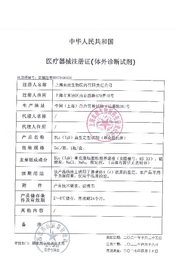 用于患者RH4(c)抗原的鉴定。本产品不用于血源筛查,仅用于临床检验
