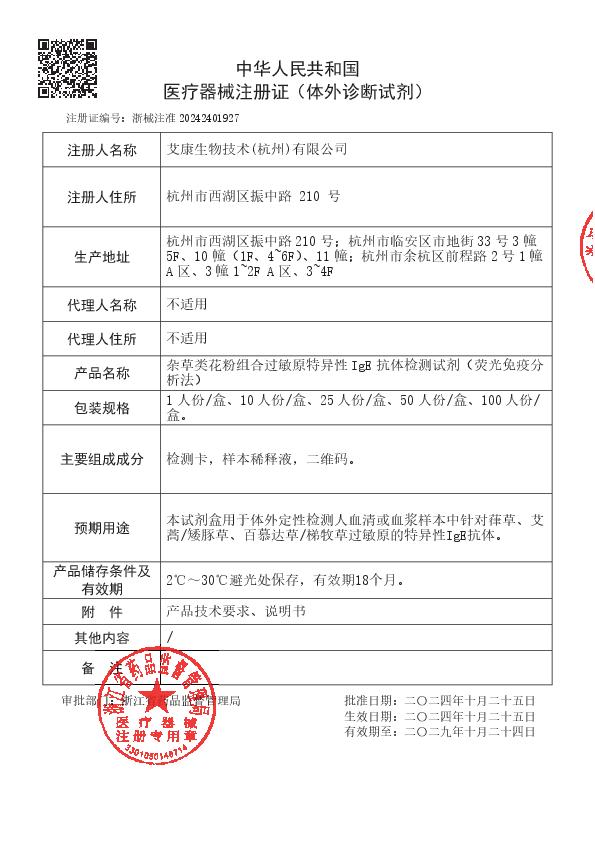 用于体外定性检测人血清或血浆样本中针对葎草、艾蒿/矮豚草、百慕达草/梯牧草过敏原的特异性IgE抗体。
