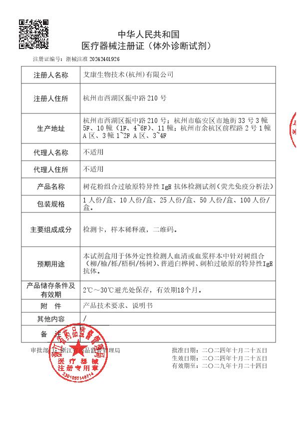 用于体外定性检测人血清或血浆样本中针对树组合(柳/榆/栎/梧桐/杨树)、普通白桦树、刺柏过敏原的特异性IgE抗体。