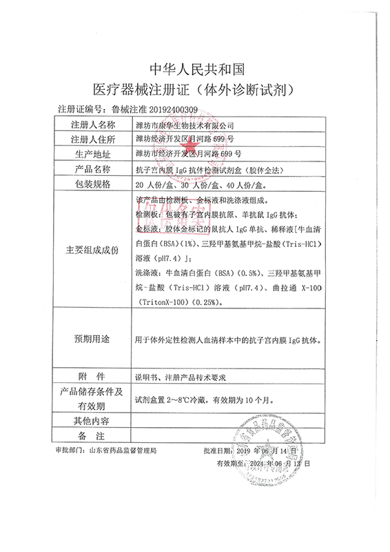 | 适用范围/预期用途 | 用于体外定性检测人血清样本中的抗子宫内膜IgG抗体。 |