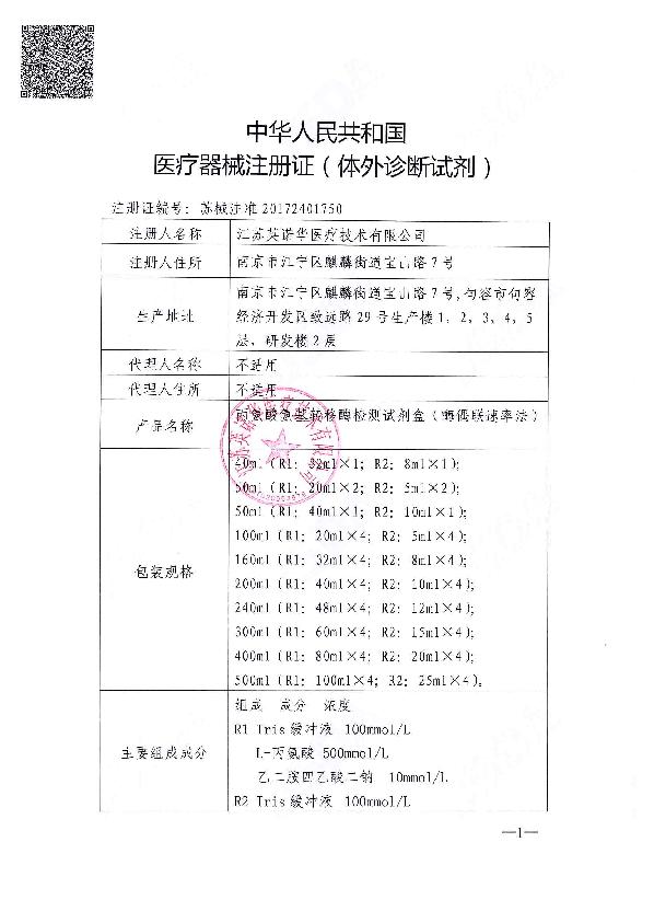 结构及组成/主要组成成分组成 成分 浓度R1 Tris缓冲液 100mmol/L L-丙氨酸 500mmol/L 乙二胺四乙酸二钠 10mmol/LR2 Tris缓冲液 100mmol/L α-酮戊二酸 100mmol/L 乳酸脱氢酶 3000U/L 还原型辅酶I二钠盐 10mmol/L
