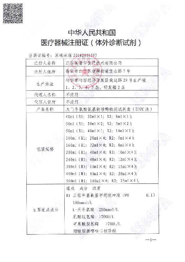 | 适用范围/预期用途 | 本试剂盒用于体外定量测定人血清中天门冬氨酸氨基转移酶的含量。 |