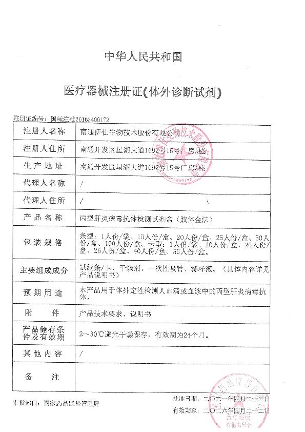 丙型肝炎病毒抗体检测试剂盒(胶体金法)注册证
