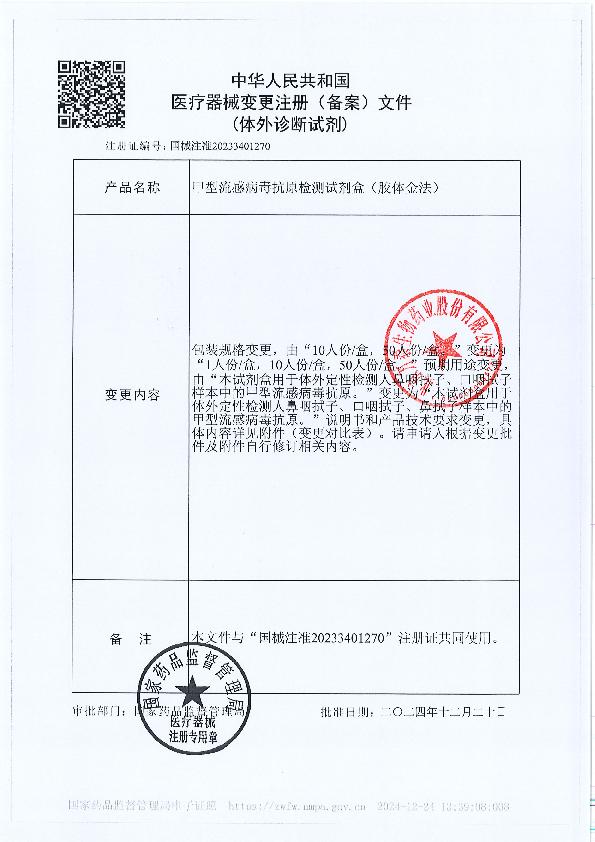 甲型流感病毒抗原检测试剂盒(胶体金法)注册证