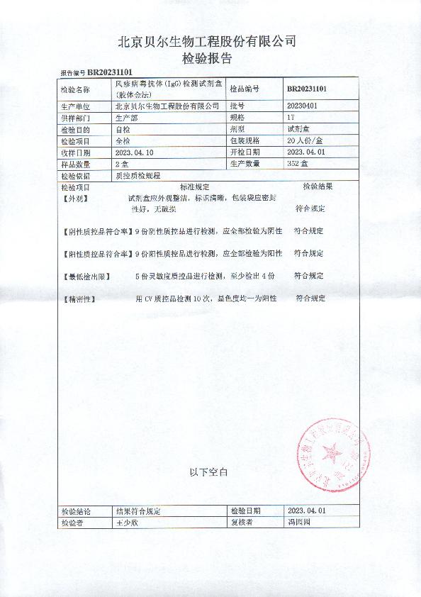 贝尔 风疹病毒抗体(IgG)检测试剂盒(胶体金法)说明书