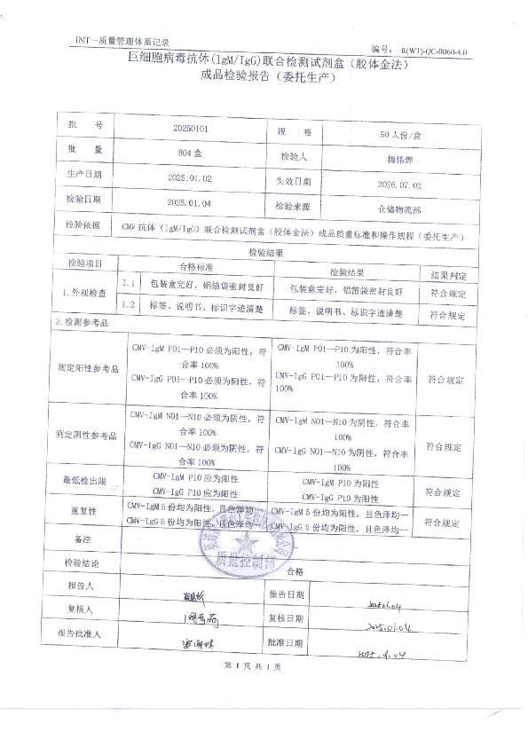 巨细胞病毒抗体(IgM/IgG)联合检测试剂盒(胶体金法)