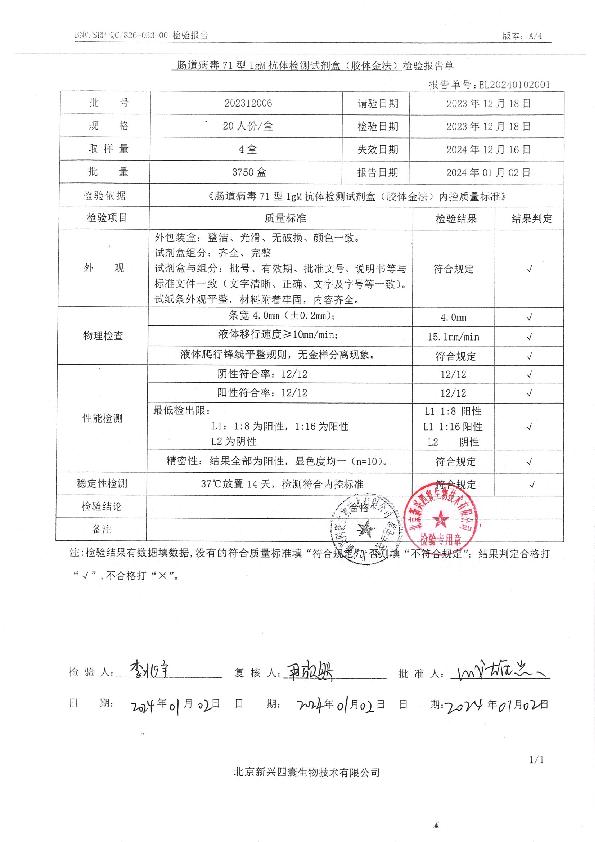 肠道病毒71型IgM抗体检测试剂盒(胶体金法)