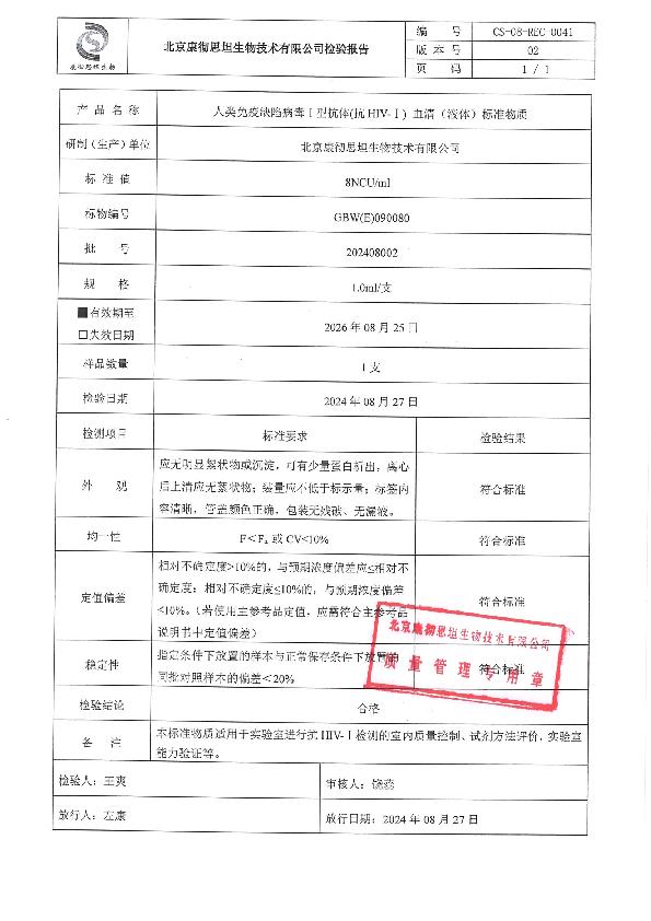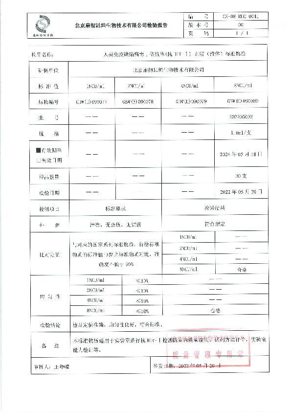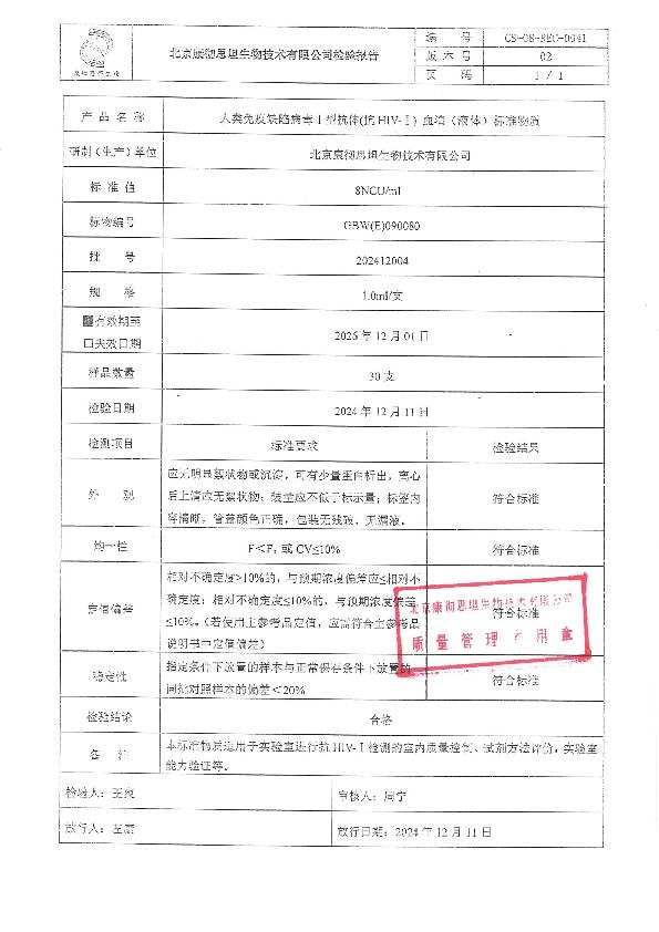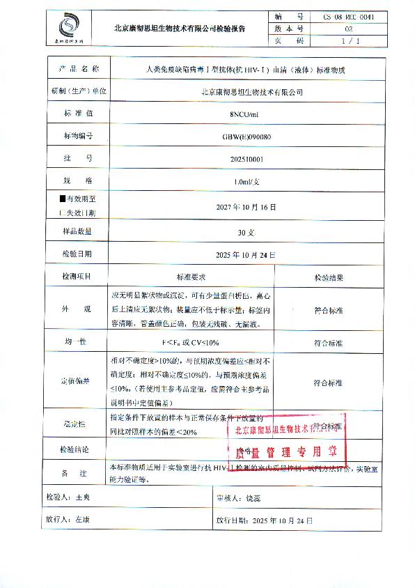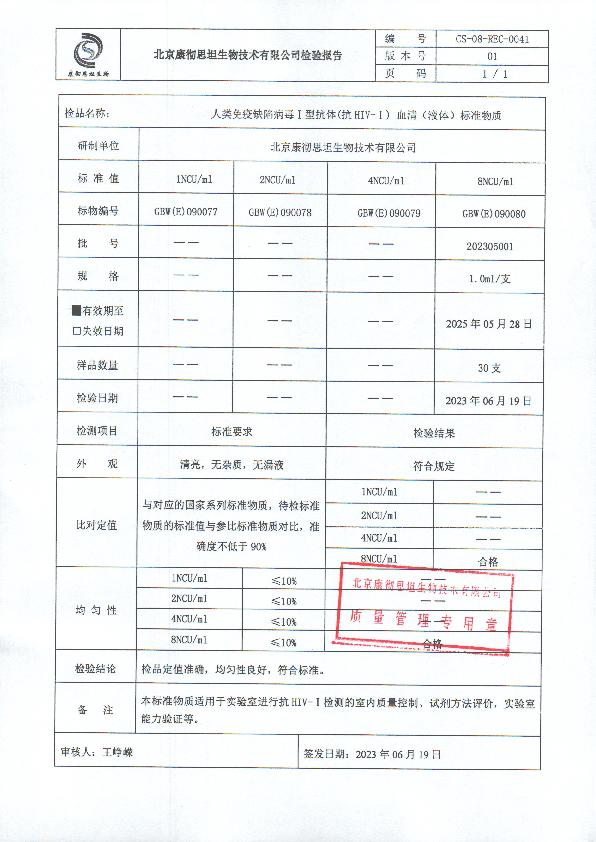 人类免疫缺陷病毒I型抗体血清(液体)标准物质