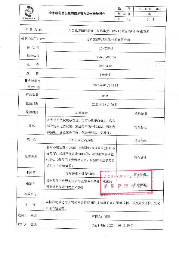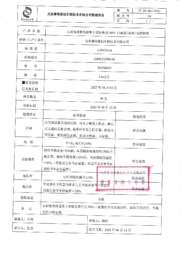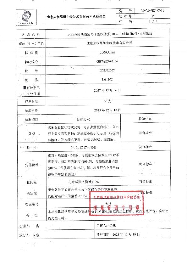 人类免疫缺陷病毒I型抗体血清(液体)标准物质
