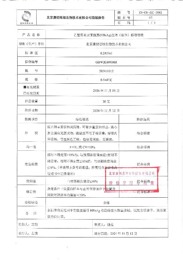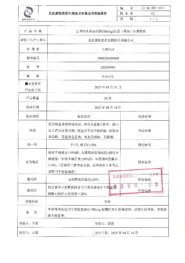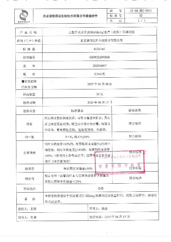 康彻思坦乙型肝炎表面抗原(HBsAg)血清(液体)标准物质说明书