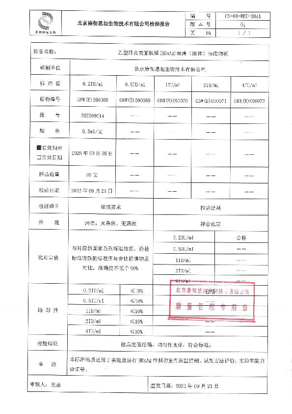 乙型肝炎表面抗原(HBsAg)(液体)质控品2023年新版本