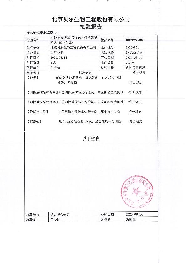 贝尔 单纯疱疹病毒I型IgM抗体检测试剂盒(胶体金法)说明书
