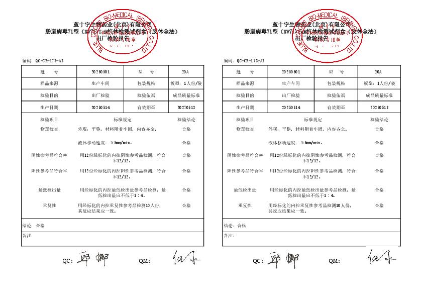 蓝十字肠道病毒71型(EV71)IgM抗体检测试剂盒(胶体金法)