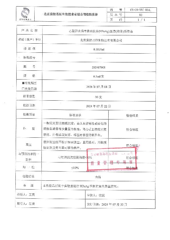 乙型肝炎表面抗原(HBsAg)(液体)质控品2023年新版本