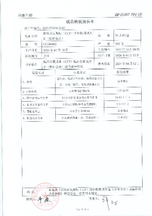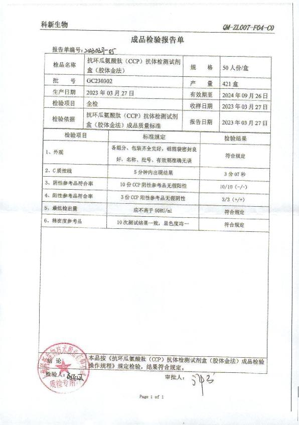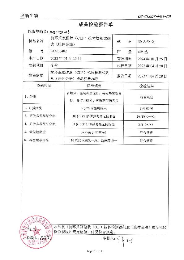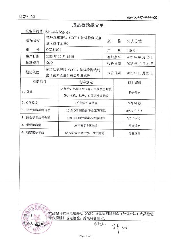 科新生物 科新 抗环瓜氨酸肽(CCP)抗体检测试剂盒(胶体金法)
