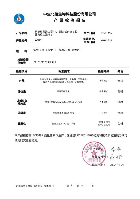 中生抗链球菌溶血素“0”测定试剂盒(胶乳免疫比浊法)