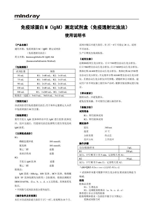 迈瑞 免疫球蛋白M(IgM)测定试剂盒(免疫透射比浊法)