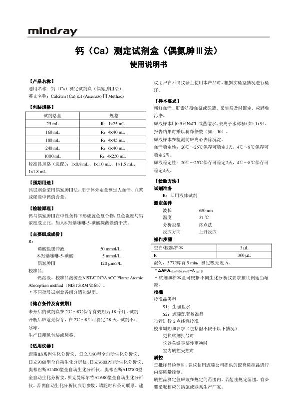 迈瑞 钙(Ca)测定试剂盒(偶氮胂III法)