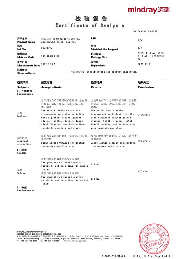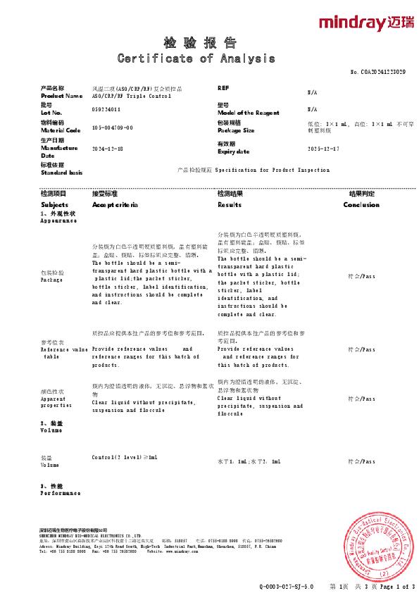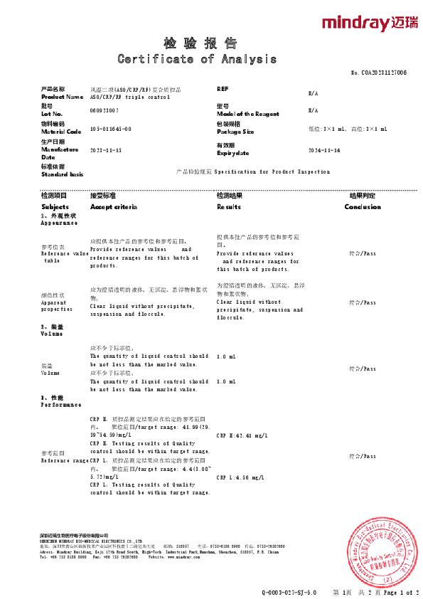 迈瑞 风湿三项(ASOCRPRF)复合质控品