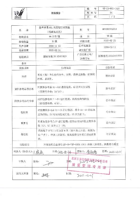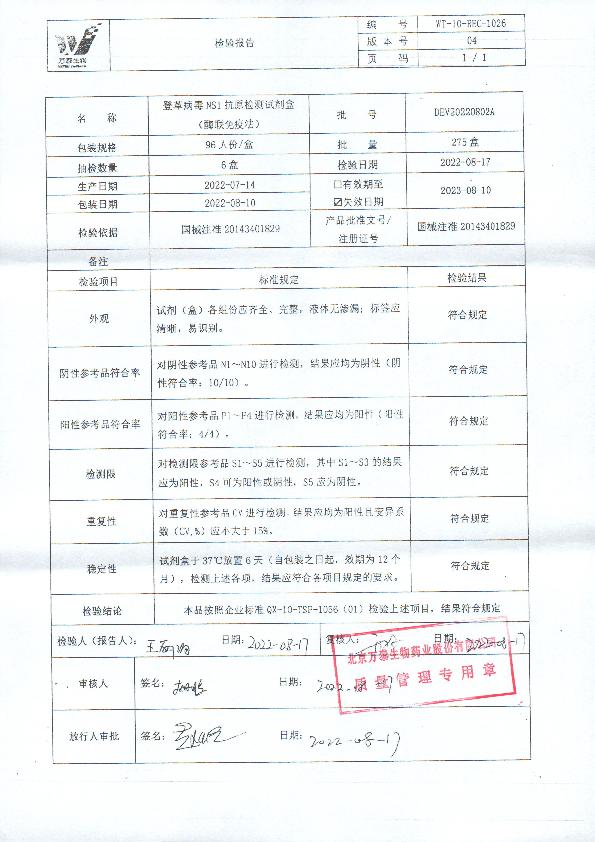 万泰登革病毒NS1抗原检测试剂盒(酶联免疫法)