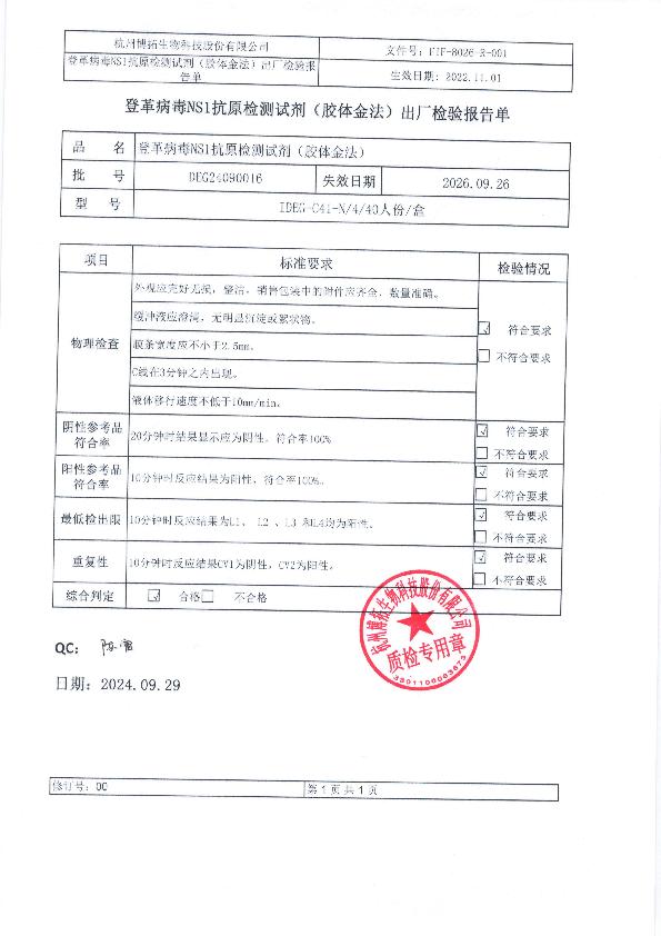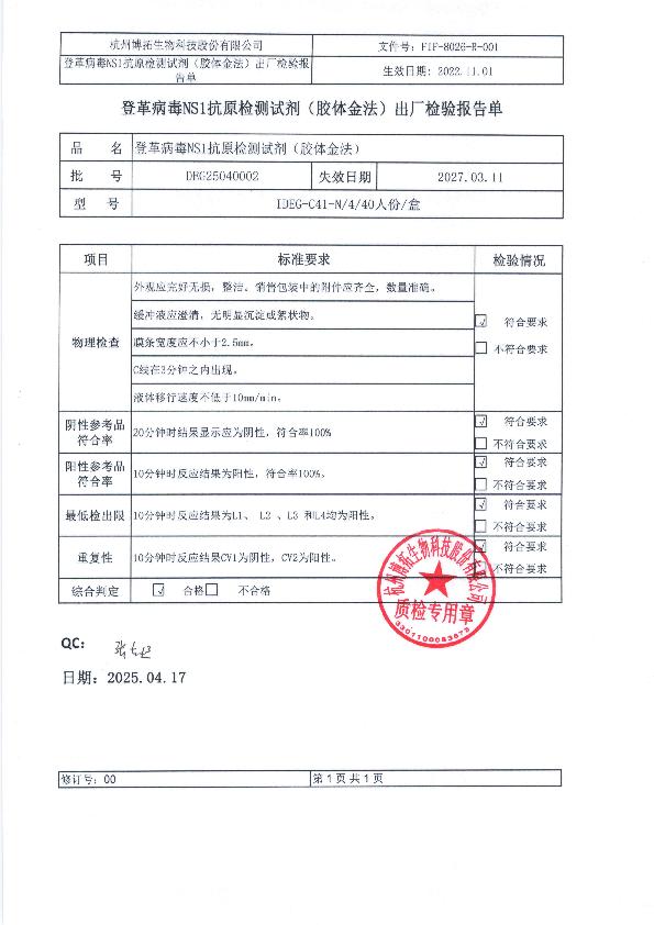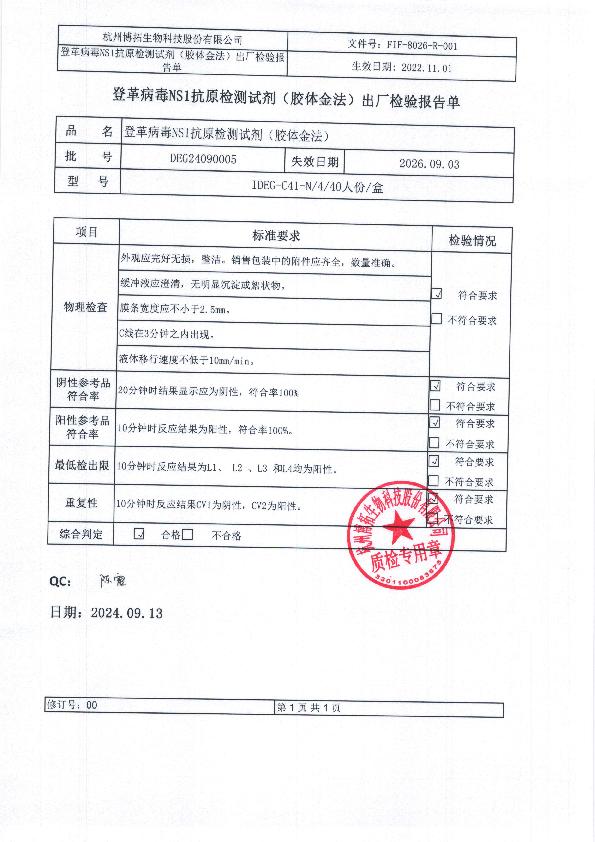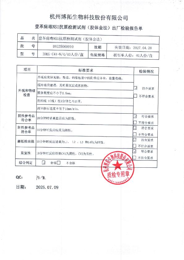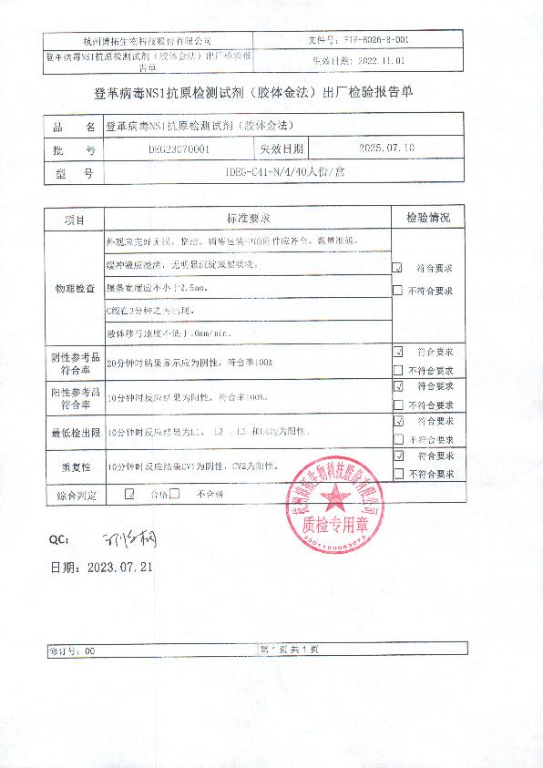 博拓登革病毒NS1抗原检测试剂(胶体金法)注册证