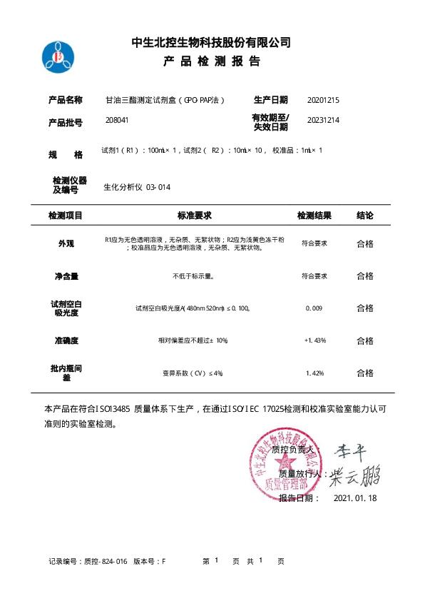 中生北控甘油三酯测定试剂盒(GPO-PAP法)说明书