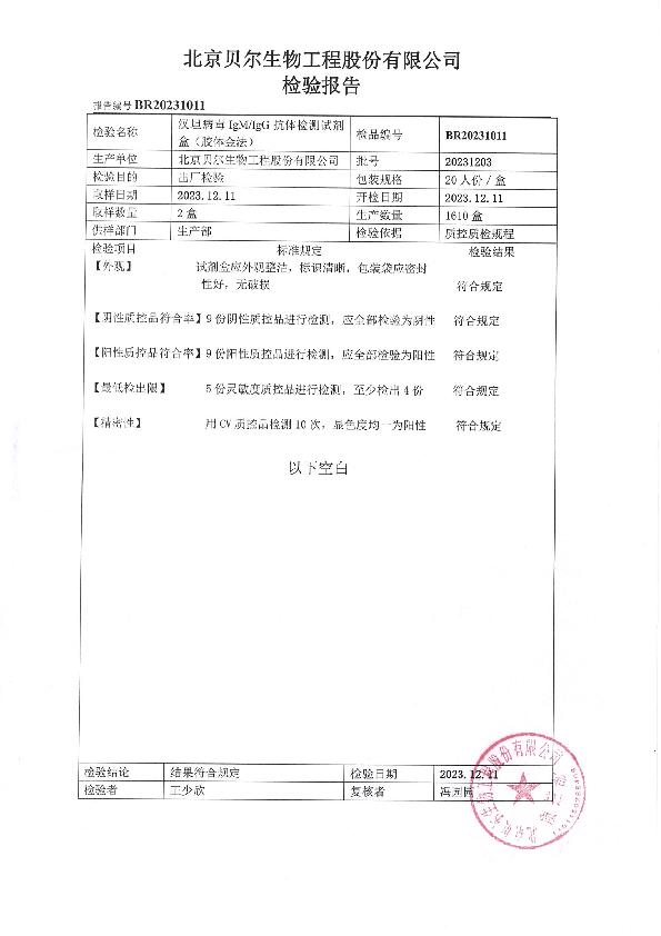 贝尔 汉坦病毒IgM.IgG抗体检测试剂盒(胶体金法)