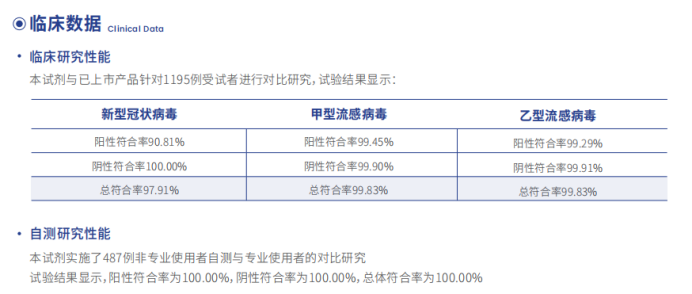 唯一真实世界研究-社区自测VS医生采样检测对比研究:在流感高峰季,通过非指定和招募的形式,患者自发去社区哨点医院进行自测与医生检测的对比,总符合率达99.64%!充分验证了其在家庭环境中的稳定表现。