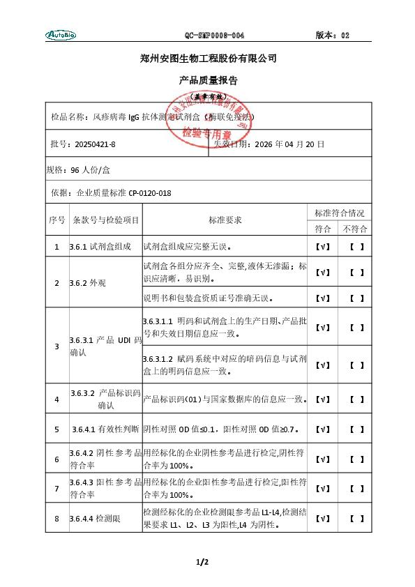 安图风疹病毒IgG抗体测定试剂盒(酶联免疫法)