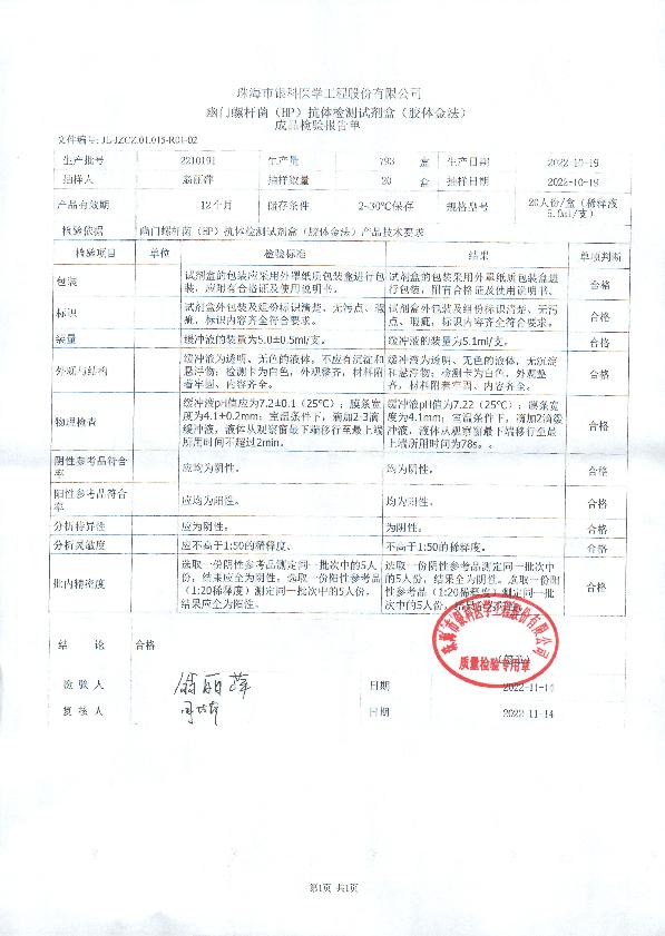 幽门螺旋杆菌(HP)抗体检测试剂盒(胶体金法)