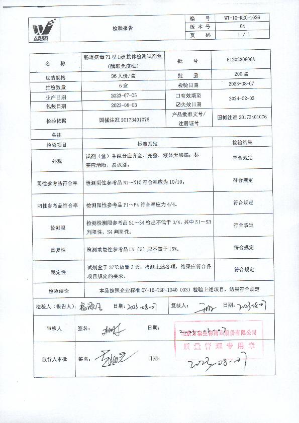 肠道病毒71型IgM抗体检测试剂盒(酶联免疫法)