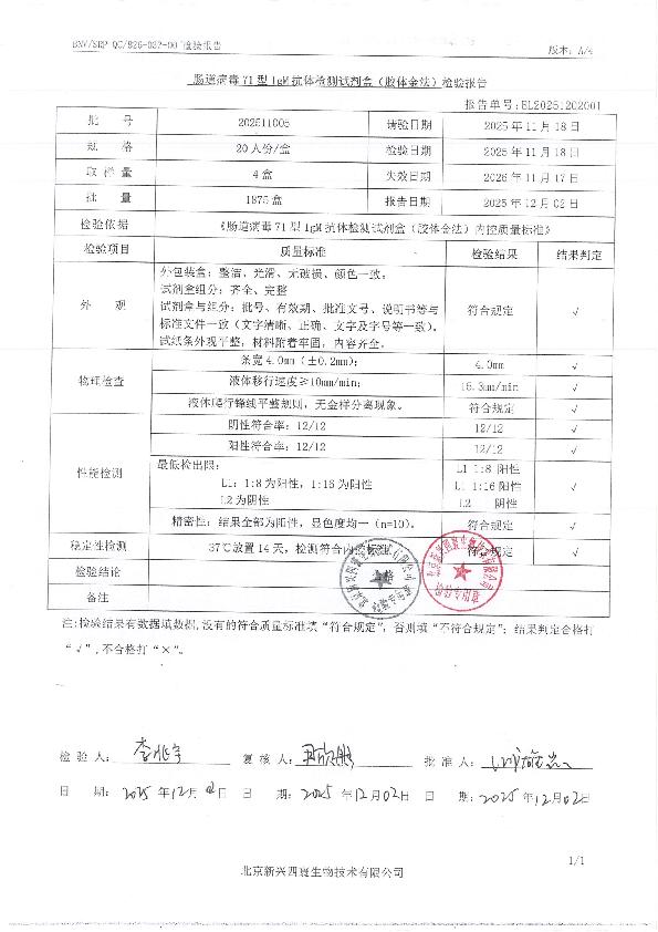 肠道病毒71型IgM抗体检测试剂盒(胶体金法)