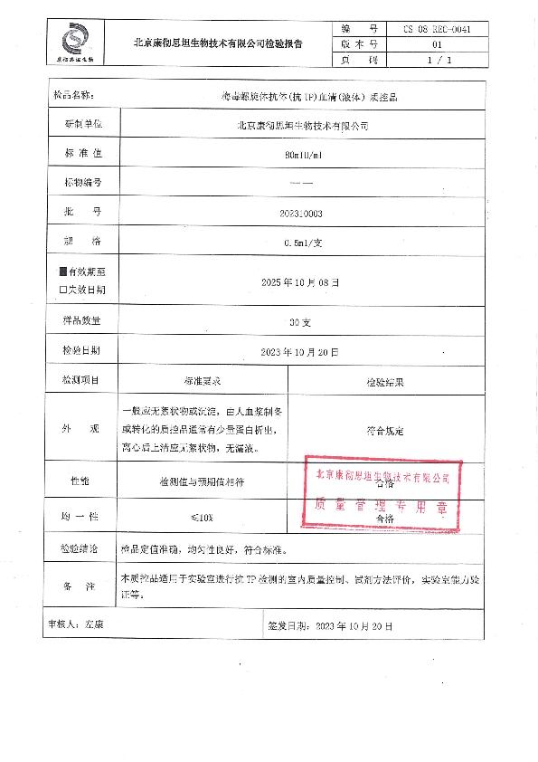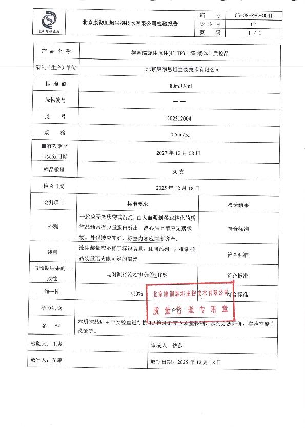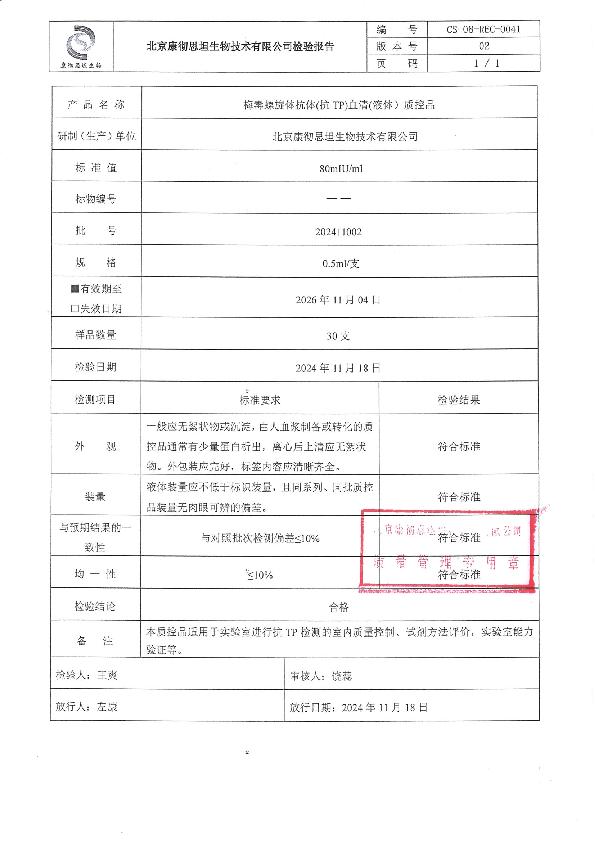 梅毒螺旋体抗体(抗TP)血清(液体)质控品80mIU/ml