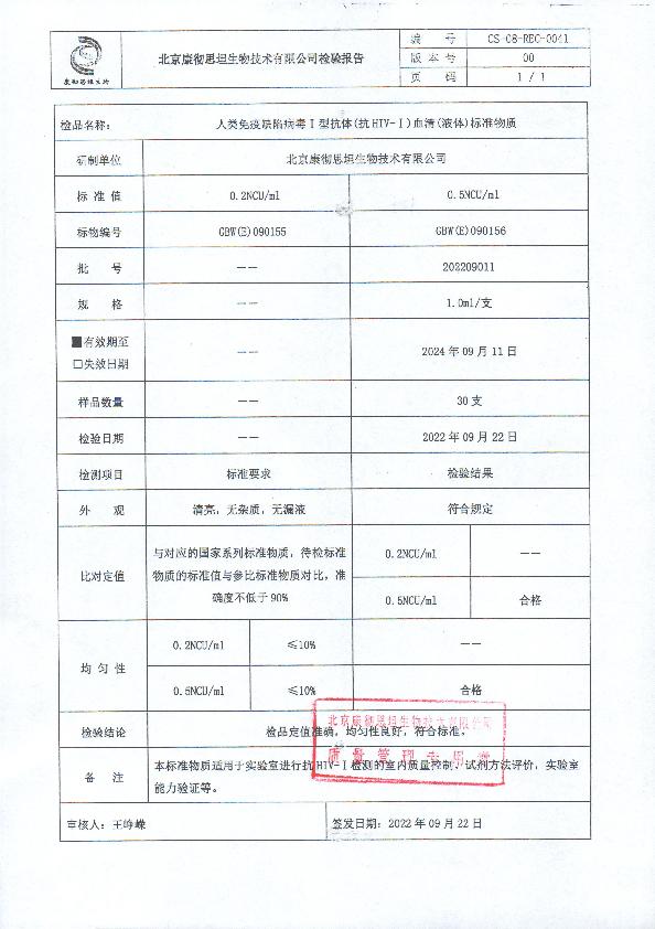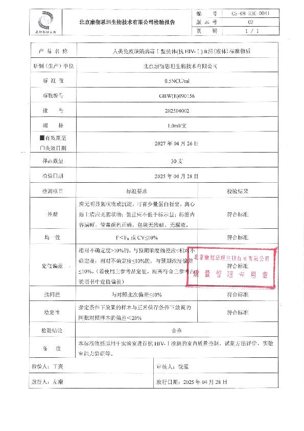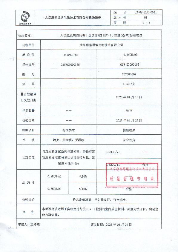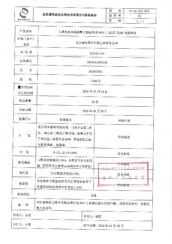 人类免疫缺陷病毒I型抗体血清(液体)标准物质