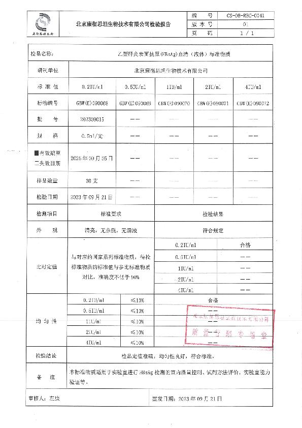 乙型肝炎表面抗原(HBsAg)(液体)质控品2023年新版本