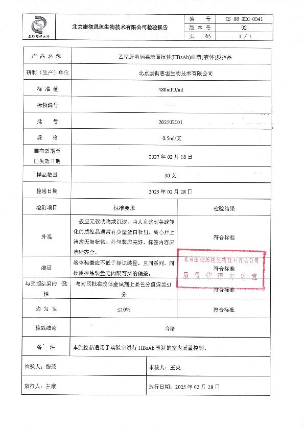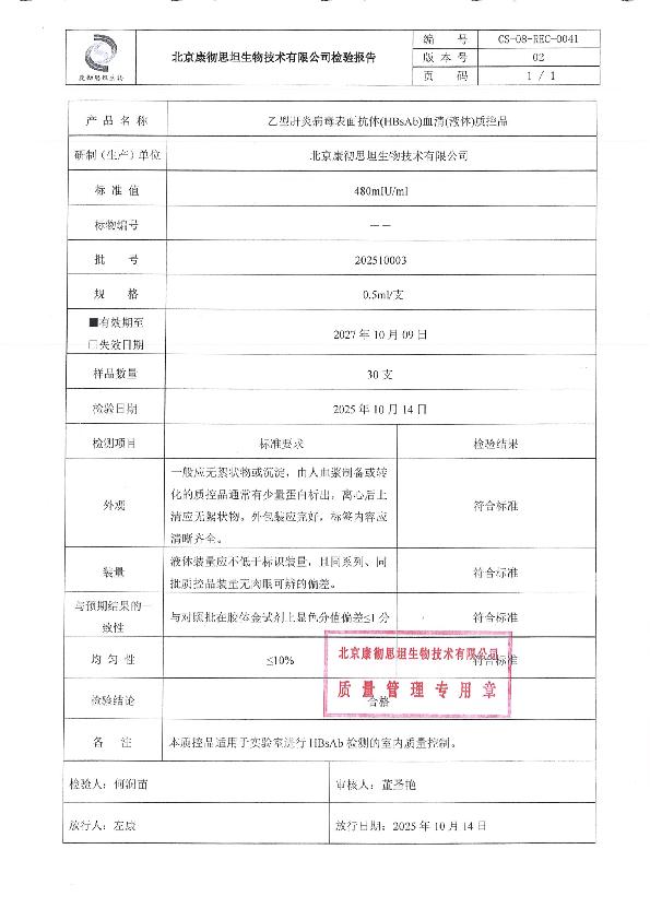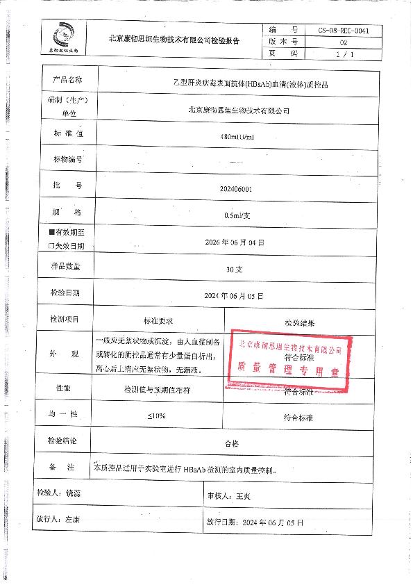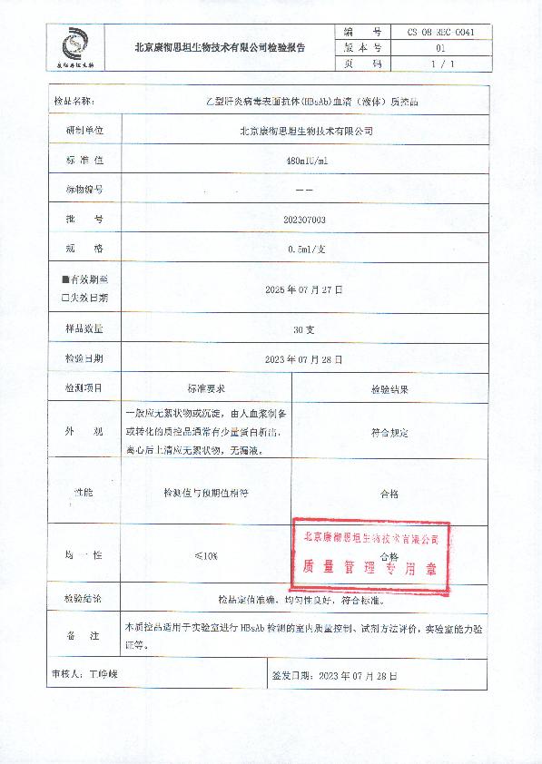 乙型肝炎病毒表面抗体(HBsAb)血清(液体)质控品