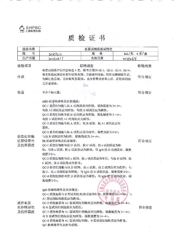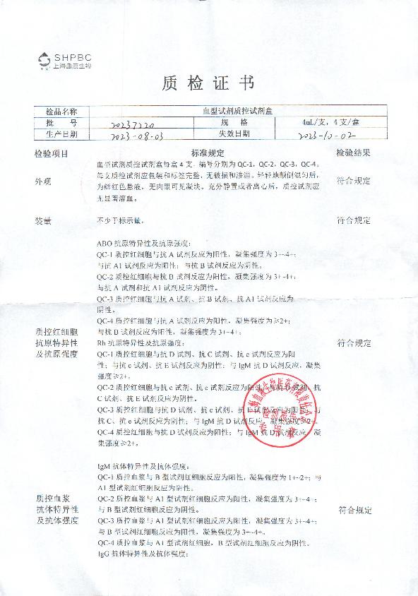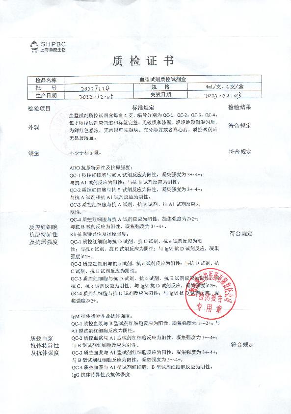 血液血型试剂质控试剂盒说明书