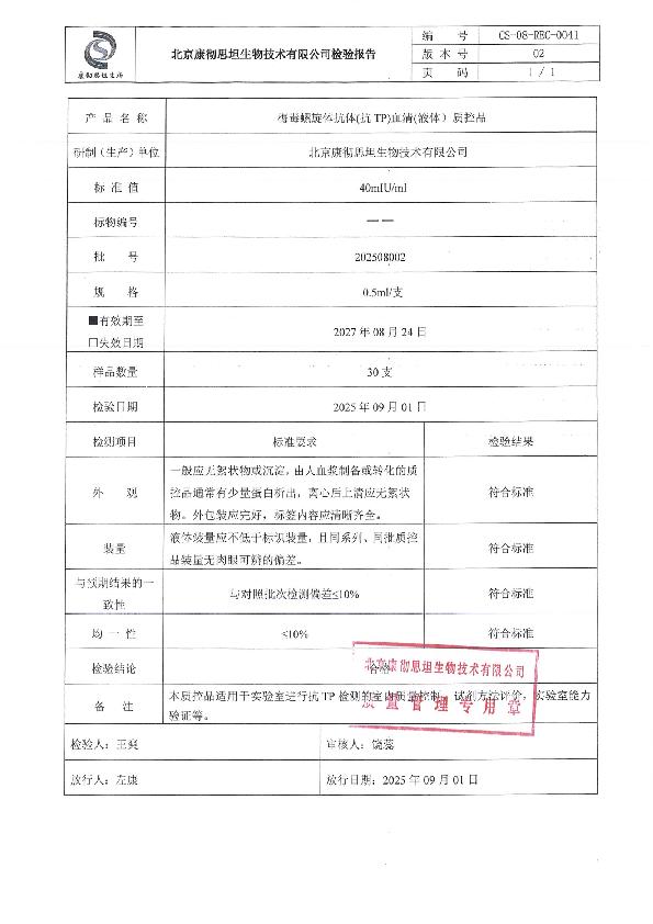 梅毒螺旋体抗体(抗TP)血清(液体)质控品