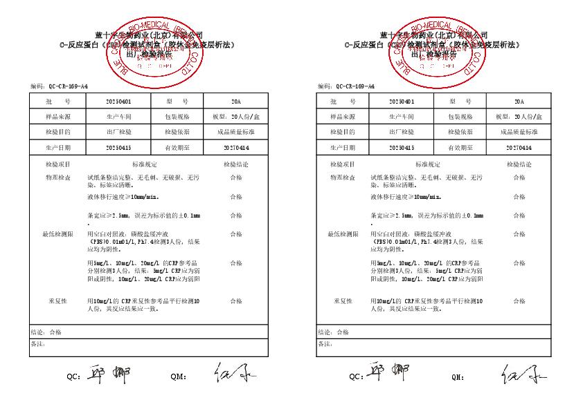 蓝十字C-反应蛋白(CRP)检测试剂盒(胶体金法)