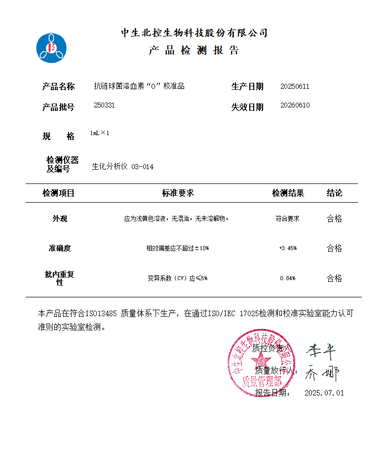 中生抗链球菌溶血素“0”校准品