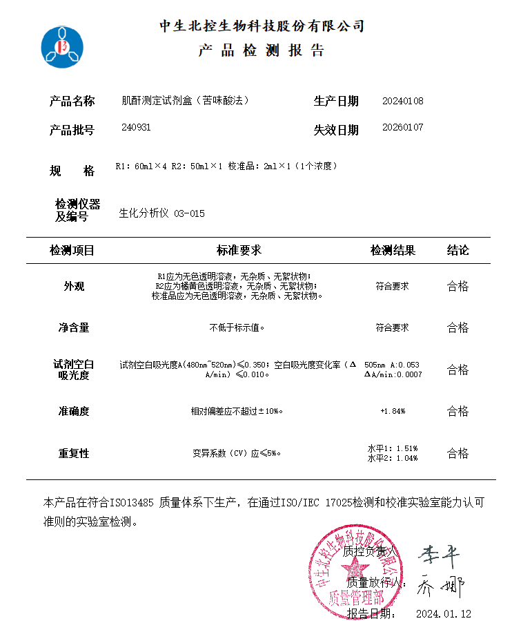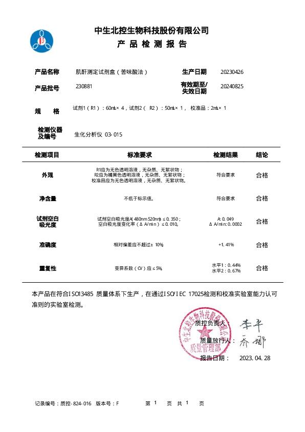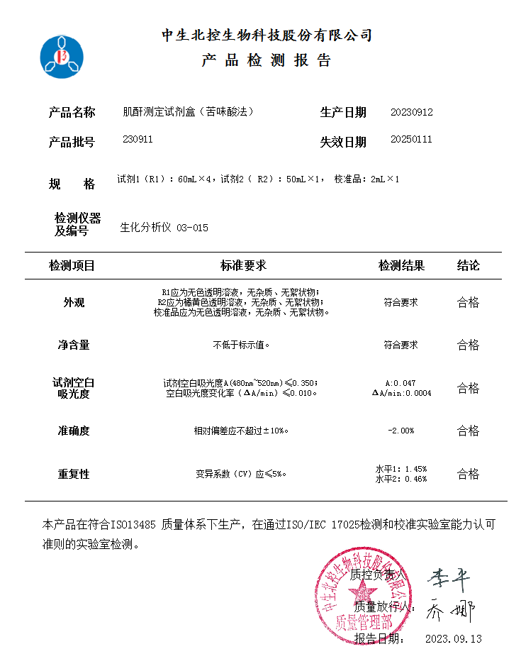 中生北控肌酐测定试剂盒(苦味酸法)说明书