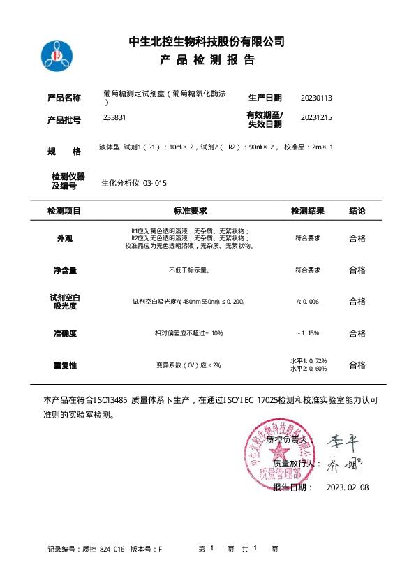 中生 葡萄糖测定试剂盒(葡萄糖氧化酶法)说明书