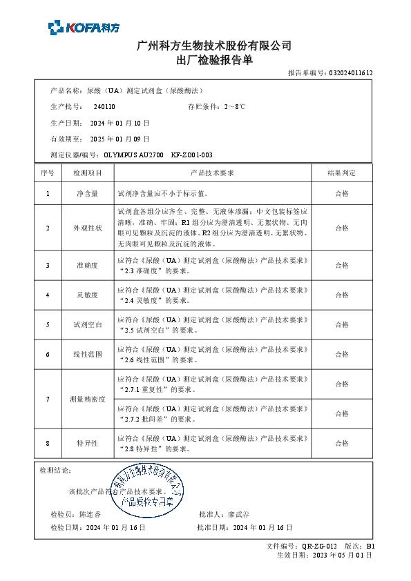 科方尿酸(UA)测定试剂盒(尿酸酶法)
