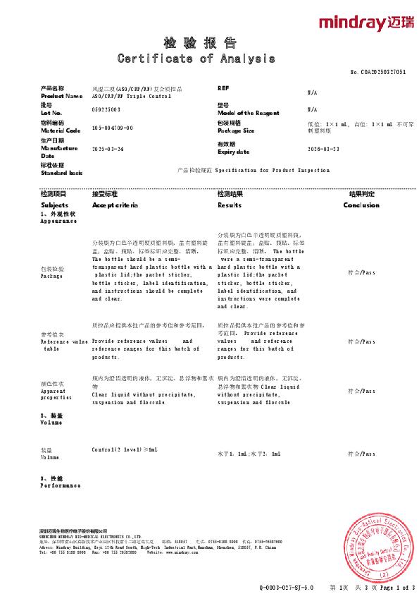 迈瑞 风湿三项(ASOCRPRF)复合质控品