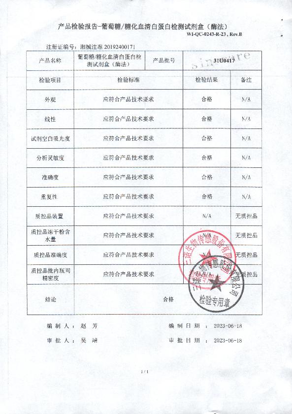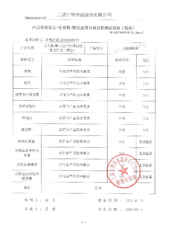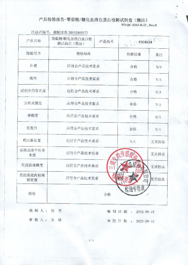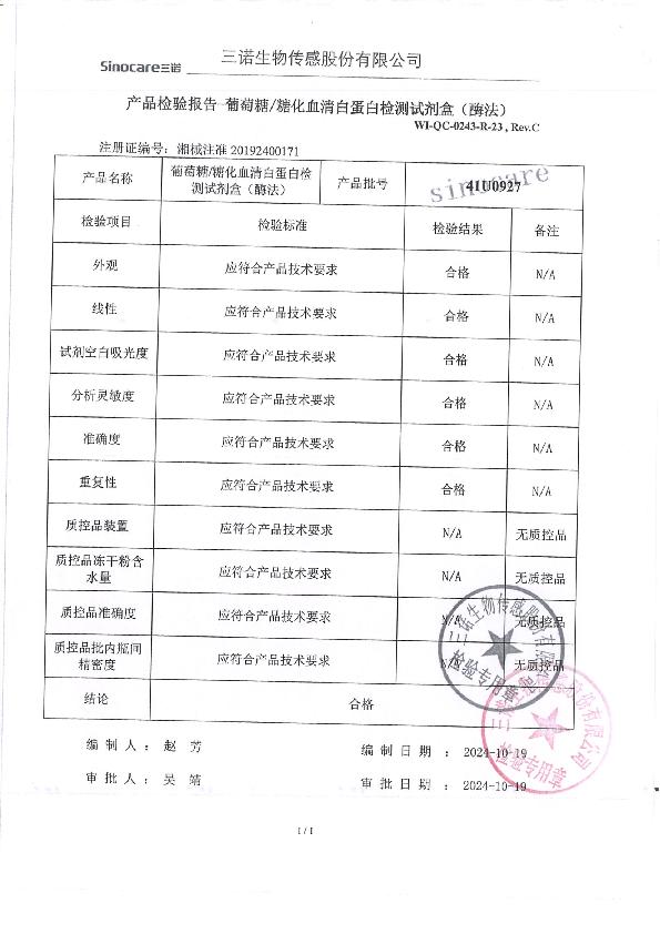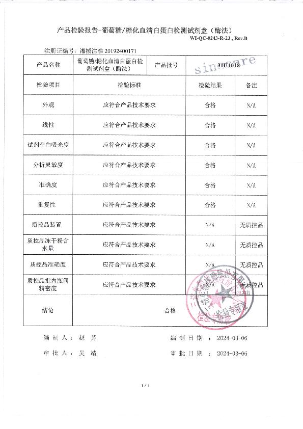 三诺生葡萄糖/糖化血清白蛋白检测试剂盒(酶法)注册证
