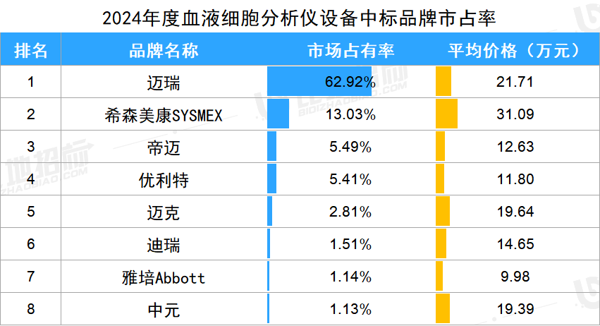 根据比地招标网数据,全面汇总了国内体外诊断领域各个细分市场设备年度中标品牌占有率数据。 2024年,14个主要IVD细分市场设备中标金额共计82.4亿。 数据显示,大多数细分领域TOP3品牌中标金额市占率超过50%。 生化分析仪中标品牌市占率TOP5 2024年1-12月,生化分析仪招投标市场有2442家采购单位,2272家中标单位,中标设备数量达3872台,中标总金额约16.85亿元。 设备品牌方面,金额市占率较高的品牌有迈瑞、贝克曼Beckman、日立HITACHI,市占分别为36.61%、18.09%、14.79%。前3品牌合计占比达69%,品牌集中度较高。 2024年1-12月,化学发光免疫分析仪招投标市场有2128家采购单位,2242家中标单位,中标设备数量达3757台,中标总金额约9.64亿元。 设备品牌方面,金额市占率较高的品牌有迈瑞、新产业、罗氏Roche,市占分别为23.58%、7.59%、7.55%。前3品牌合计占比达39%,具有一定的品牌集中度。 2024年1-12月,全自动血液细胞分析仪招投标市场有1878家采购单位,1733家中标单位,中标设备数量达2999台,中标总金额约6.33亿元。 设备品牌方面,金额市占率较高的品牌有迈瑞、希森美康、帝迈,市占分别为62.92%、13.03%、5.49%。前3品牌合计占比达81%,品牌集中度非常高。 2024年1-12月,凝血分析仪招投标市场有997家采购单位,963家中标单位,中标设备数量达1639台,中标总金额约2.80亿元。 设备品牌方面,金额市占率较高的品牌有迈瑞、希森美康SYSMEX、雷杜,市占分别为30.89%、24.74%、5.29%。前3品牌合计占比达61%,品牌集中度较高。雷杜、赛科希德受个别大批量采购项目影响,平均价格相对较低。 2024年1-12月,基因测序仪招投标市场有325家采购单位,324家中标单位,中标设备数量达504台,中标总金额约8.06亿元。 设备品牌方面,金额市占率较高的品牌有华大智造、因美纳Illumina、赛默飞,市占分别为50.05%、9.01%、7.23%。前3品牌合计占比达66%,品牌集中度较高。 2024年1-12月,微生物鉴定及药敏分析系统招投标市场有261家采购单位,244家中标单位,中标设备数量达307台,中标总金额约1.54亿元。 市占率较高的品牌有梅里埃、安图、迪尔,市占分别为50.23%、16.40%、12.86%。前3品牌合计占比达79%,品牌集中度非常高。 2024年1-12月,全自动酶免分析仪招投标市场有298家采购单位,283家中标单位,中标设备数量达396台,中标总金额约2.77亿元。 设备品牌方面,金额市占率较高的品牌有爱康、澳斯邦、艾德康,市占分别为38.76%、24.26%、20.15%。前3品牌合计占比达83%,品牌集中度非常高。 2024年1-12月,特定蛋白分析仪招投标市场有220家采购单位,217家中标单位,中标设备数量达291台,中标总金额约0.33亿元。 设备品牌方面,金额市占率较高的品牌有博士泰、国赛、贝克曼库尔特,市占分别为22.24%、19.39%、11.75%。前3品牌合计占比达53%,品牌集中度较高。 比地招标网统计:2024年1-12月,PCR仪招投标市场有1744家采购单位,2106家中标单位,中标设备数量达4793台,中标总金额约11.59亿元。 设备品牌方面,金额市占率较高的品牌有赛默飞Thermo、伯乐BioRad、赛沛Cepheid,市占分别为16.29%、9.45%、8.68%。前3品牌合计占比达34%,具有一定的品牌集中度。