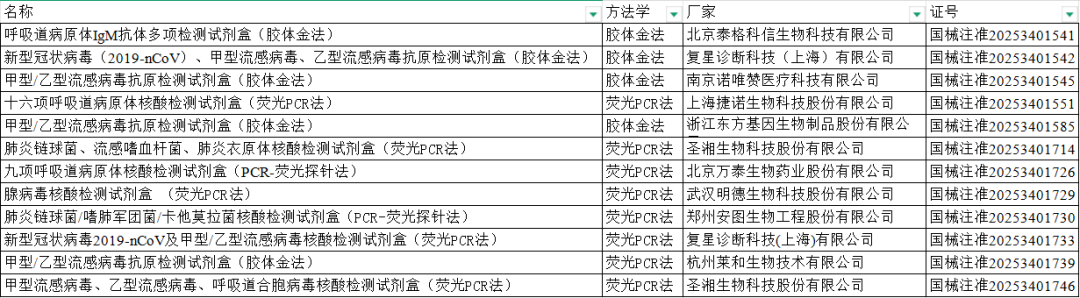 8月,国家药品监督管理局批准12项呼吸道相关检测试剂盒,胶体金法4项,PCR法8项。